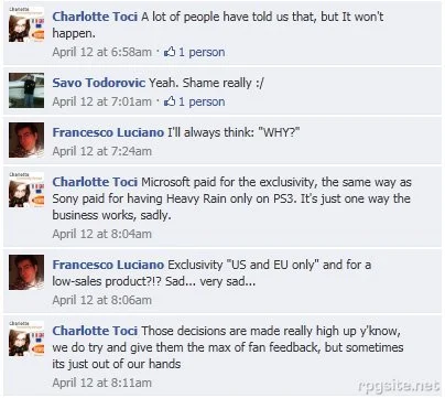 Did you happen to see the news last week about Charlotte Toci, the Bandai Namco Europe community manager (or “junior community manager,” apparently) who wrote some posts on Facebook responding to a fan asking about the PS3 version of Tales of Vesperia, and if BN would still localize it and bring it out (Vesperia on PS3 has a new character and other stuff left out of the original Xbox 360 version)? Toci said no, and that it was because Microsoft paid for the game’s 360 exclusivity outside Japan. The original post was actually from April, but didn’t get wide attention until recently. Here’s Exhibit A: